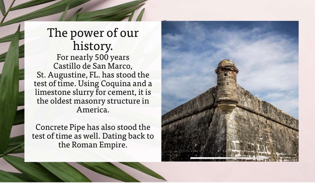 In the infrastructure world, we are continually building. The intent and purpose of the vast majority of projects, is not temporary, but meant to last for future generations to use and enjoy. Which is why I support the manufacturers we represent every day. RCP, Trench Drain, Slotted Drain and Fabricated Pipe are all used for one purpose. Improving the lives and safety of others. It is mostly out of site and more often than not, out of mind. But it is there, part of the infrastructure fabric and foundation of American Life. Much like the Castillo de San Marcos. Nearly 500 years later, it is still open to the public to view, enjoy and learn about our history. I am sure the builders has sustainability in mind when they built this majestic Masonry Structure.